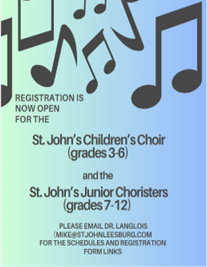 Registration for the St. John’s Children’s Choir (grades 3-6) and the St. John’s Junior Choristers (grades 7-12) is now open! Please email Dr. Langlois
